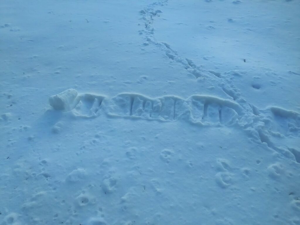 午後になると小さなスノーボールは、失敗した「雪まくり」のようになっていた。大きくなった足跡は「雪男」が歩いた跡のようだ。