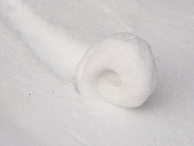 風によって積もった雪がまくられて、シートを巻いたような円筒形になる現象だ。私の見たスノーボールは「雪まくり」の一歩手前ぐらいだろう。