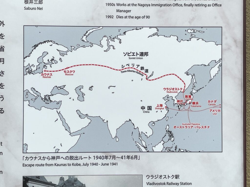 「命のビザ」を受け取ったユダヤ人は、リトアニアを脱出してシベリア鉄道でウラジオストクまで行き、船に乗って敦賀に上陸、そして神戸に向かいました。神戸に滞在したユダヤ人難民は杉原ビザ保有者を含めて4,000人を超え、次の目的地が決まるまで1週間から数カ月間神戸に滞在しました。